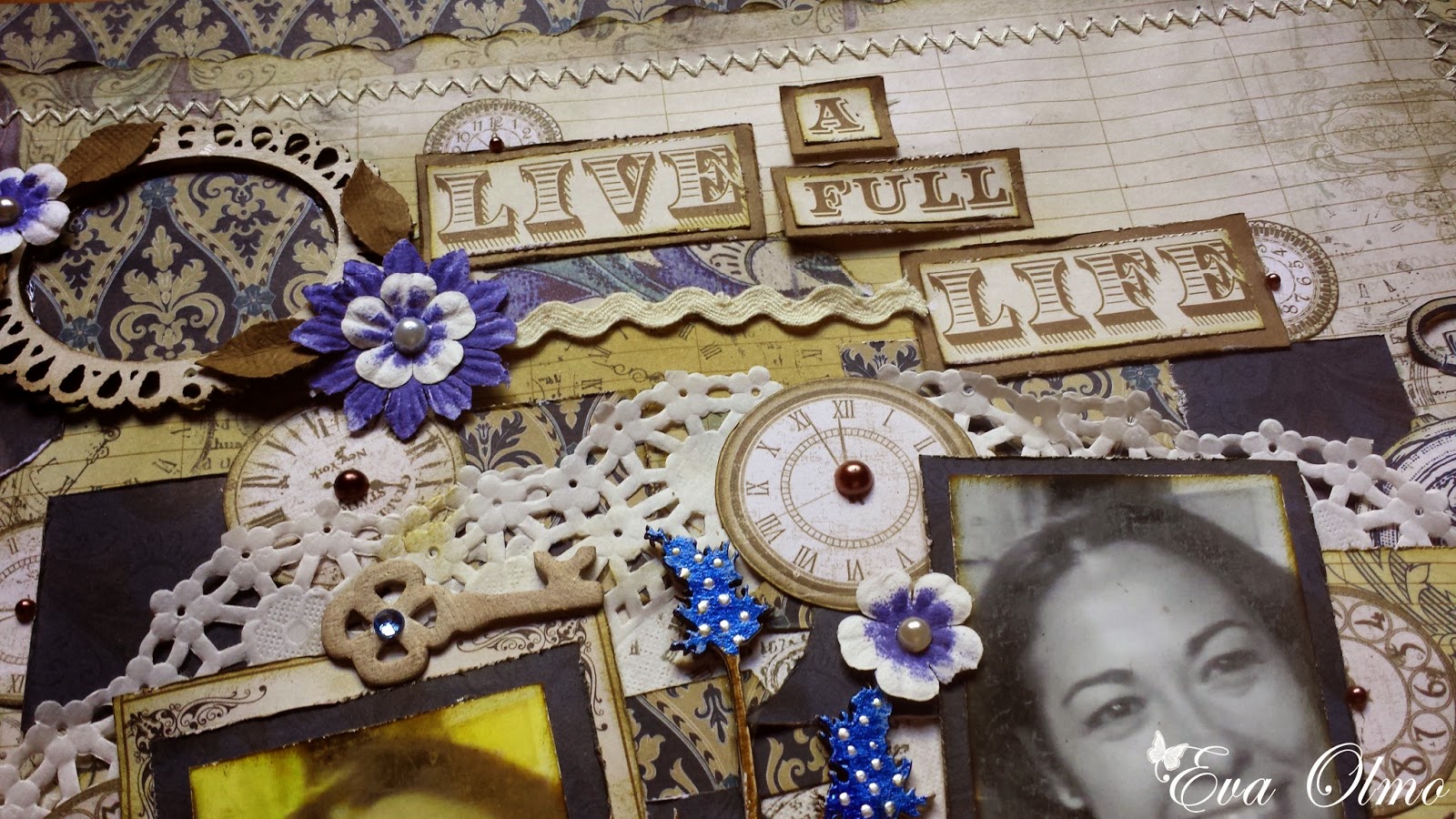 Coloqué un par de blondas detrás de las fotos. Recorté unos cuantos relojes y en medio de las dos fotos pequé un adorno pintado de The Dustty Attic. ( Si os gusta en