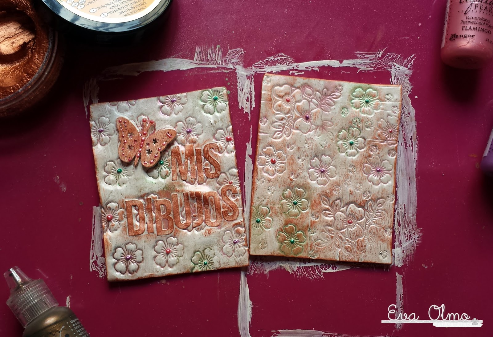 Una vez bien seca la pasta apliqué con el dedo un poco de pintura Inka Gold, en tonos dorado y ocre, para proporcionarle al fondo un poco de brillo.